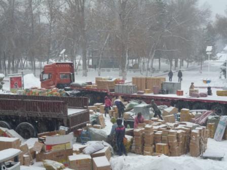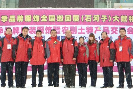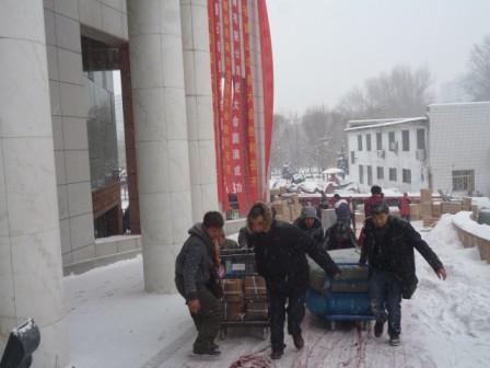 在圆满完成亚欧博览会检查服务、乌洽二期精品丝绸展销、克拉玛依品牌展销、库尔勒冬季品牌换季展销等届大会的全程服务任务后,旭峰一分公司全体同仁于11月28日马不停蹄赶到国家军垦名城石河子,准备于12月1日在这里定期举办“冬季品牌服装服饰暨农副土特产品交易会”。可就在大家紧锣密鼓的准备30日布展的前夜,突然遇到入冬以来的第二场大雪来袭,给原本就紧张的布展工作,增加了巨大的压力。展馆外广场上,原本未化的积雪,加上新降的大雪足足有两尺厚。还没来得及卸货的四辆十八米的汽车,被一层厚厚的积雪覆盖,静静地停在广场上,就像几座横卧的小雪山。早晨前来准备接货的展商都被眼前的场面惊呆了,这可怎么办呢?困难吓不倒旭峰人,在现场负责人夏安生、李大林及展馆主要负责人带领下,一支抵抗、战胜风雪的大军迅速组成,许多展商也不约而同的参加到清扫积雪的第一线。经过一个多小时紧张战斗,很快清扫出一块近200多平米的场地来准备卸货使用。可就在货车发动还没停稳在被清扫的场地上时,老天却又跟大家开起了玩笑。忽然间漫天雪花从天空中飘落下来,而且一会比一会急,一会比一会大,眨眼间人们的身上、地上、刚被打开帆布的汽车上,又被厚厚的雪花覆盖。困难出好汉,危机显英雄。面对突然降临的暴雪,现场没有一个人说停下,也没有人嚷困难,公司全体员工除留下办公室在办手续的员工外,其余全都参与风雪的搏斗。大家与展商以及文化宫干部职工,铲的铲、扫的扫、铺路的铺路、卸车的卸车、相关的布展工作同步展开。展商们你追我赶搬运自己的货物,经过踩踏、碾压的积雪,由于寒冷很快在地上形成厚厚的冰夹,人们稍不留神就会滑倒在地上,加上进展馆的路本身是一个较长的上坡,许多展商货拉到半路就再也走不动。李永涛和公司临聘的几位员工就马上组成了推车队,专门为上坡的展商推车加油,大大加快了搬运的速度。雪在不停的下,人们在不停的扫,下一层清一层。雪花落在脖子里,本来又冷又凉,可人们觉得却很舒服,因为每个人浑身都在冒汗,所以飘落下的雪花,正好让大家清凉一下。整个展馆内外形成一个激烈鏖战的场面,给许多来此游览的人们留下了良好的印象。